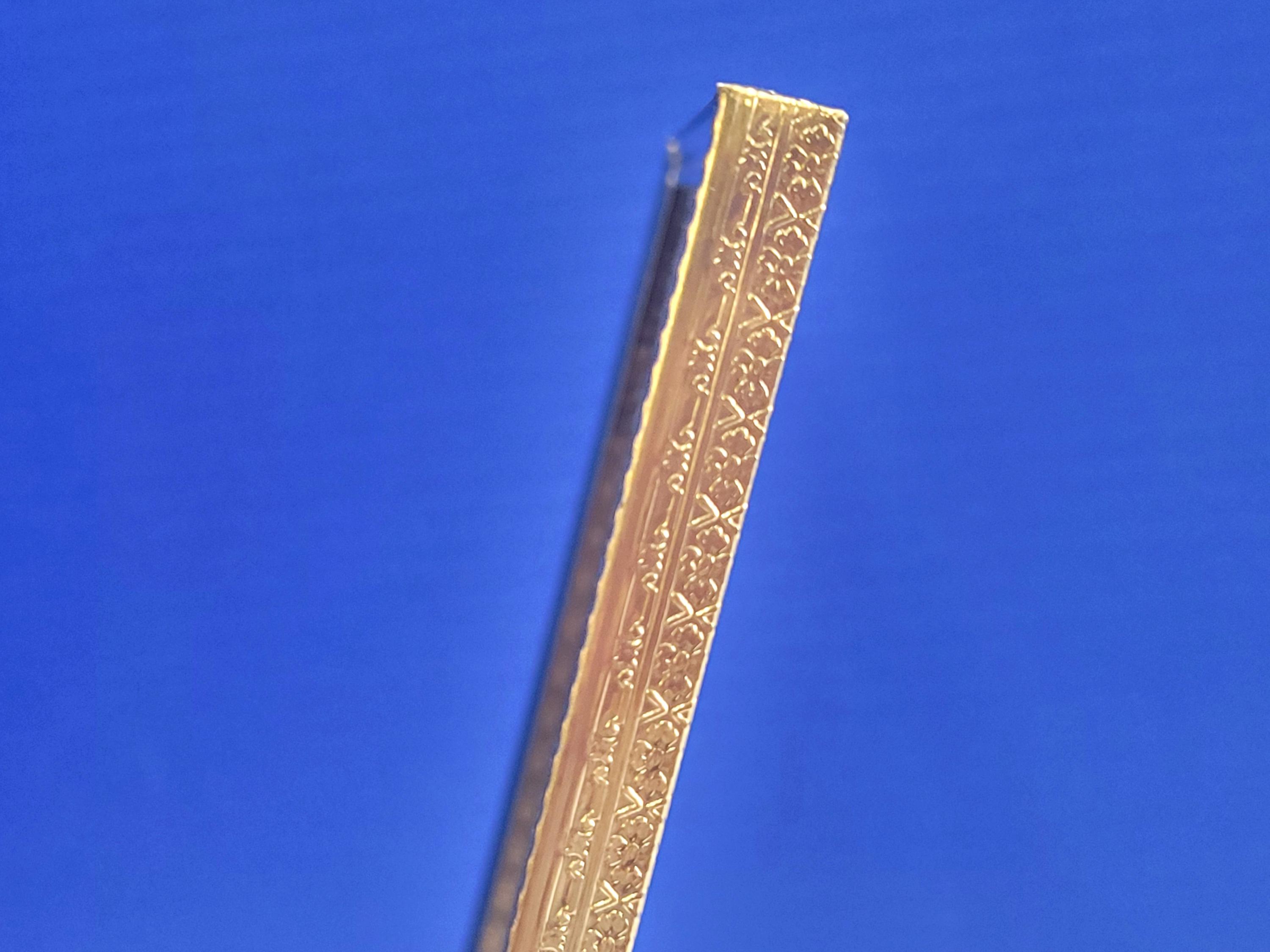 A pretty brass metal frame with a kickstand on the back and a glass front. Good condition.